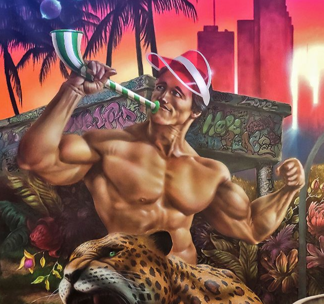 Arnold Schwarzenegger und Michael Jordan in einer ausgeflippten Umgebung mit retro Lichteinfall und verschiedenen kleinen Details.